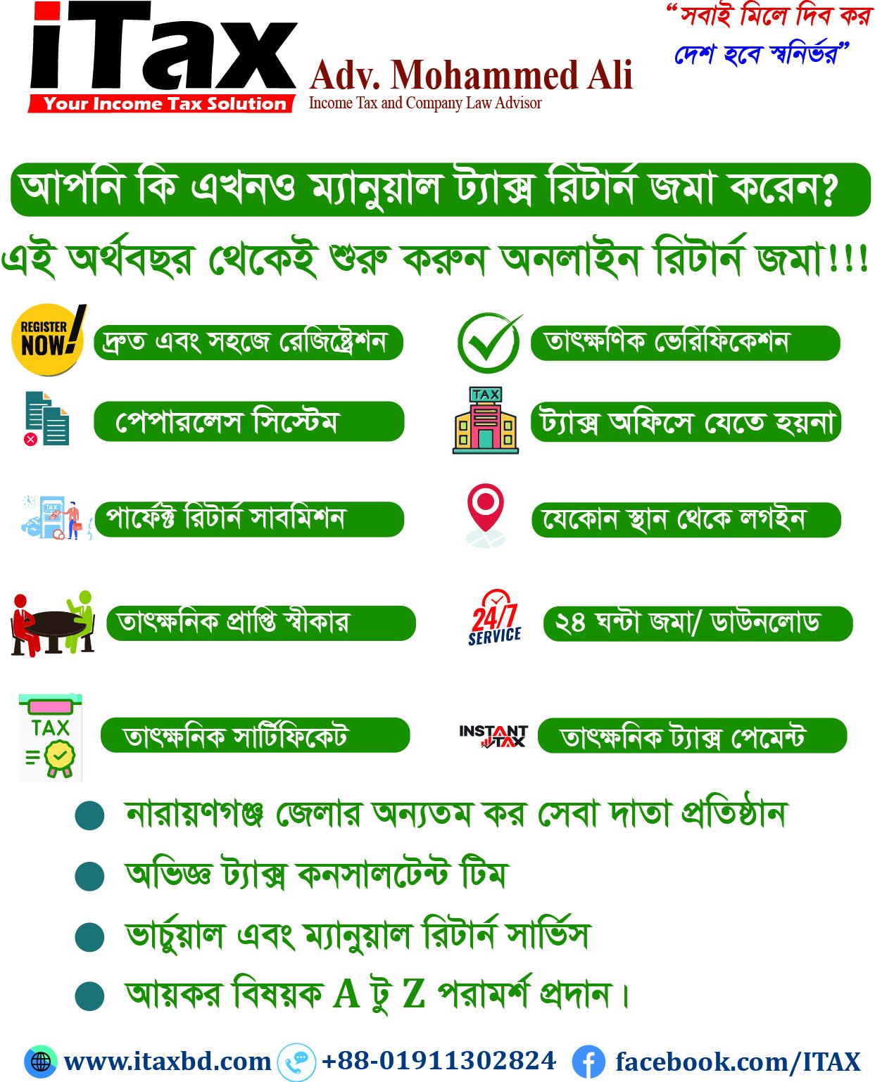 240 B.B Road, (President Road), Narayanganj, Bangladesh.Phone: 01911302824, Email: advmdali0@gmail.comWeb: www.itaxbd.com